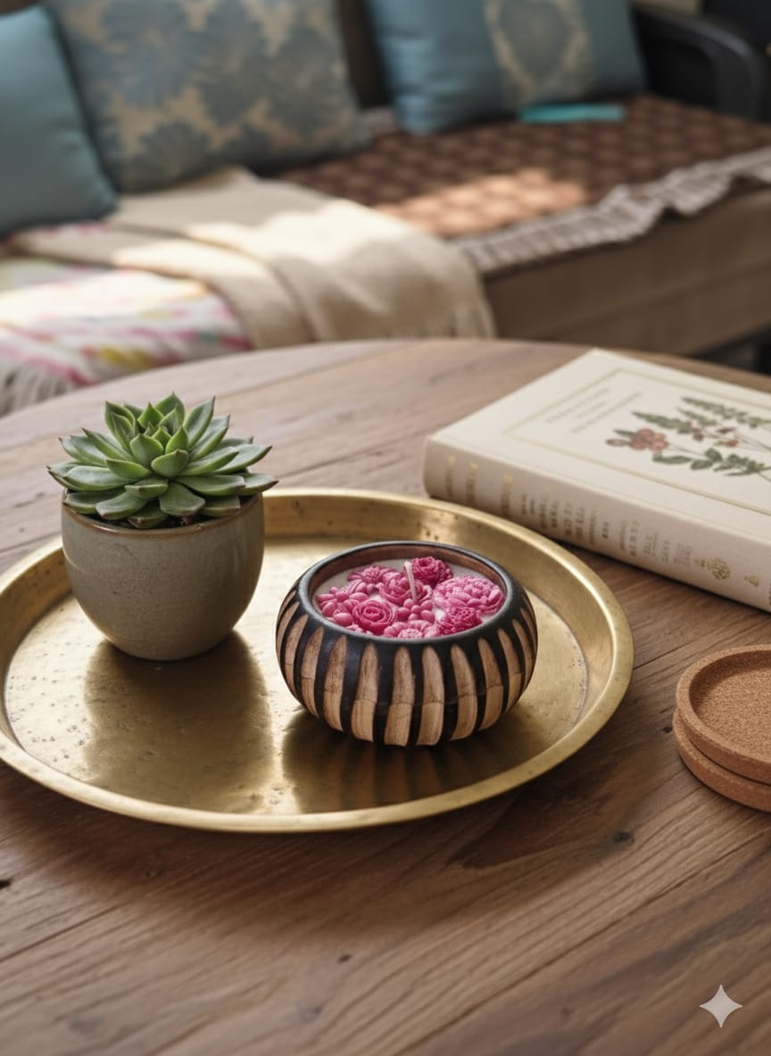 Kamini - The beauty of a glowing bloom is an exquisite candle set in a natural wooden bowl, thoughtfully decorated with a variety of floral elements such as sunflowers, pink blossoms, and other delicate blooms. Each piece offers a unique arrangement that highlights organic textures and colors, creating a sophisticated and calming ambiance. Perfect for enhancing home decor or as a refined gift, Kamini combines artistry and nature to bring warmth and elegance to any setting.